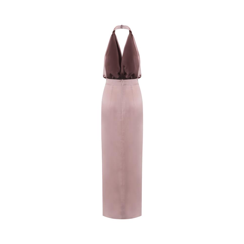 Abito con scollo all’americana, drappeggiato, schiena nuda. Chiusura posteriore con zip.