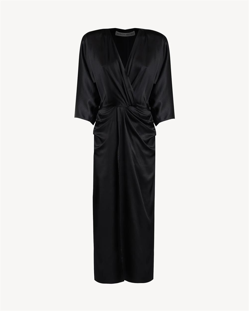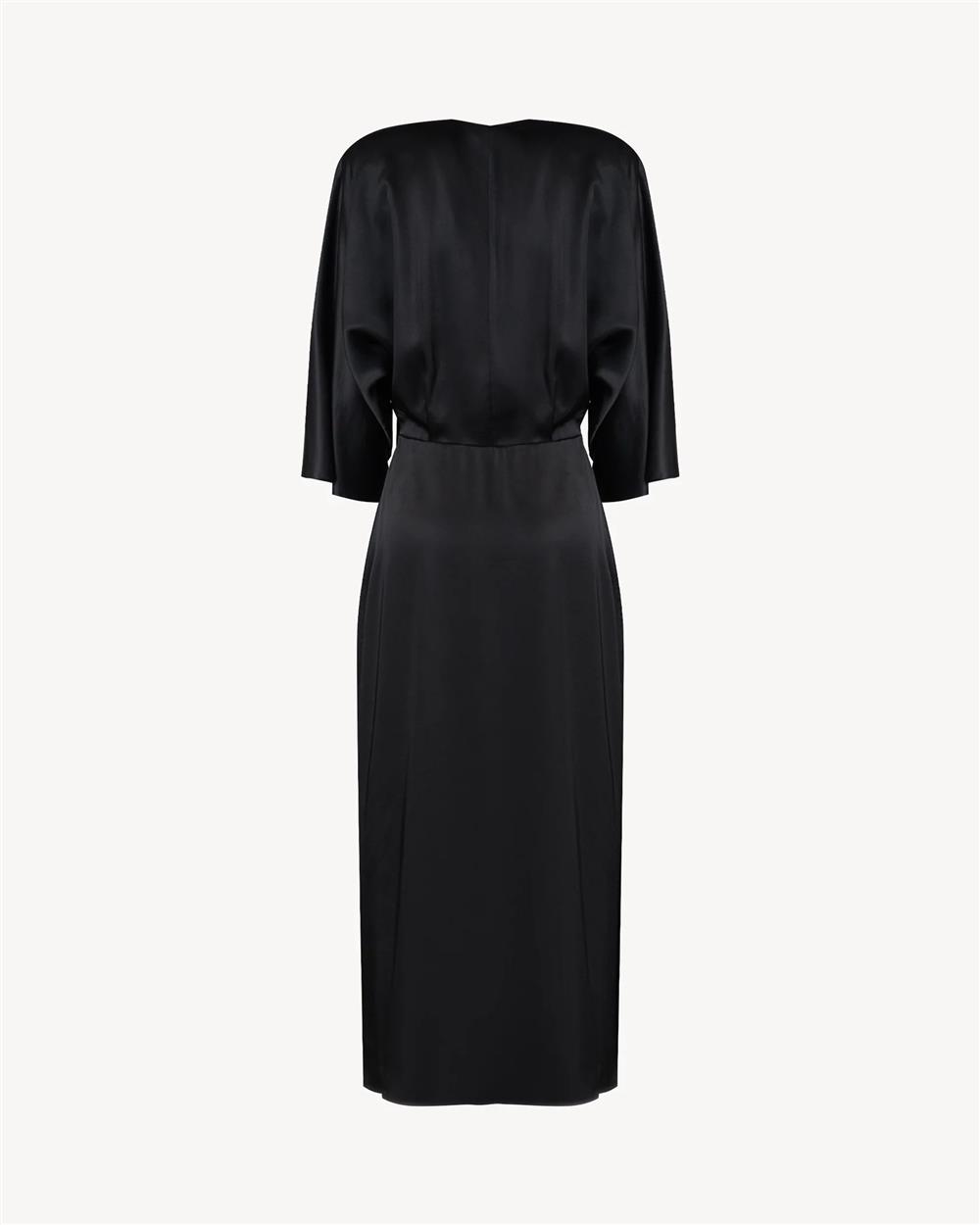 Abito midi in satin con linea fluida. Presenta scollo a V incrociato, maniche a kimono e costruzione drappeggiata in vita. Gonna con apertura frontale.