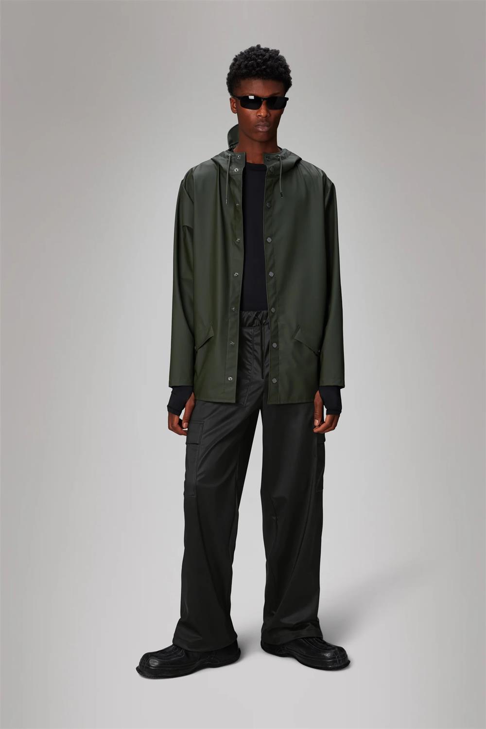 La Jacket è realizzata nell’iconico tessuto PU di Rains e presenta cuciture nastrate. Il finish è leggero, morbido al tocco