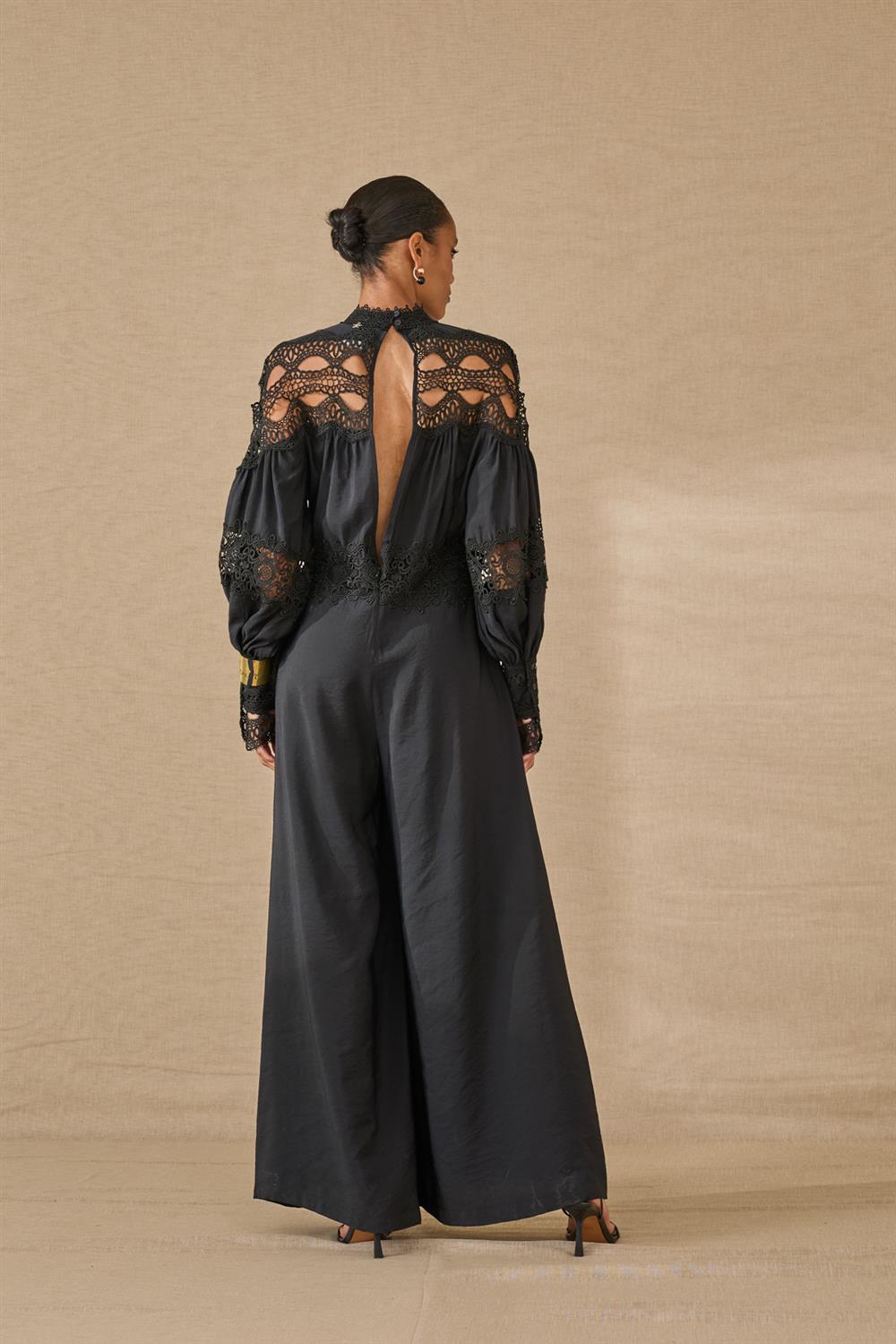 Tuta in modal con inserti macrame’. Modello gamba ampia, colletto rialzato, chiusura sul retro con bottoncini e zip, con bracciale incluso.