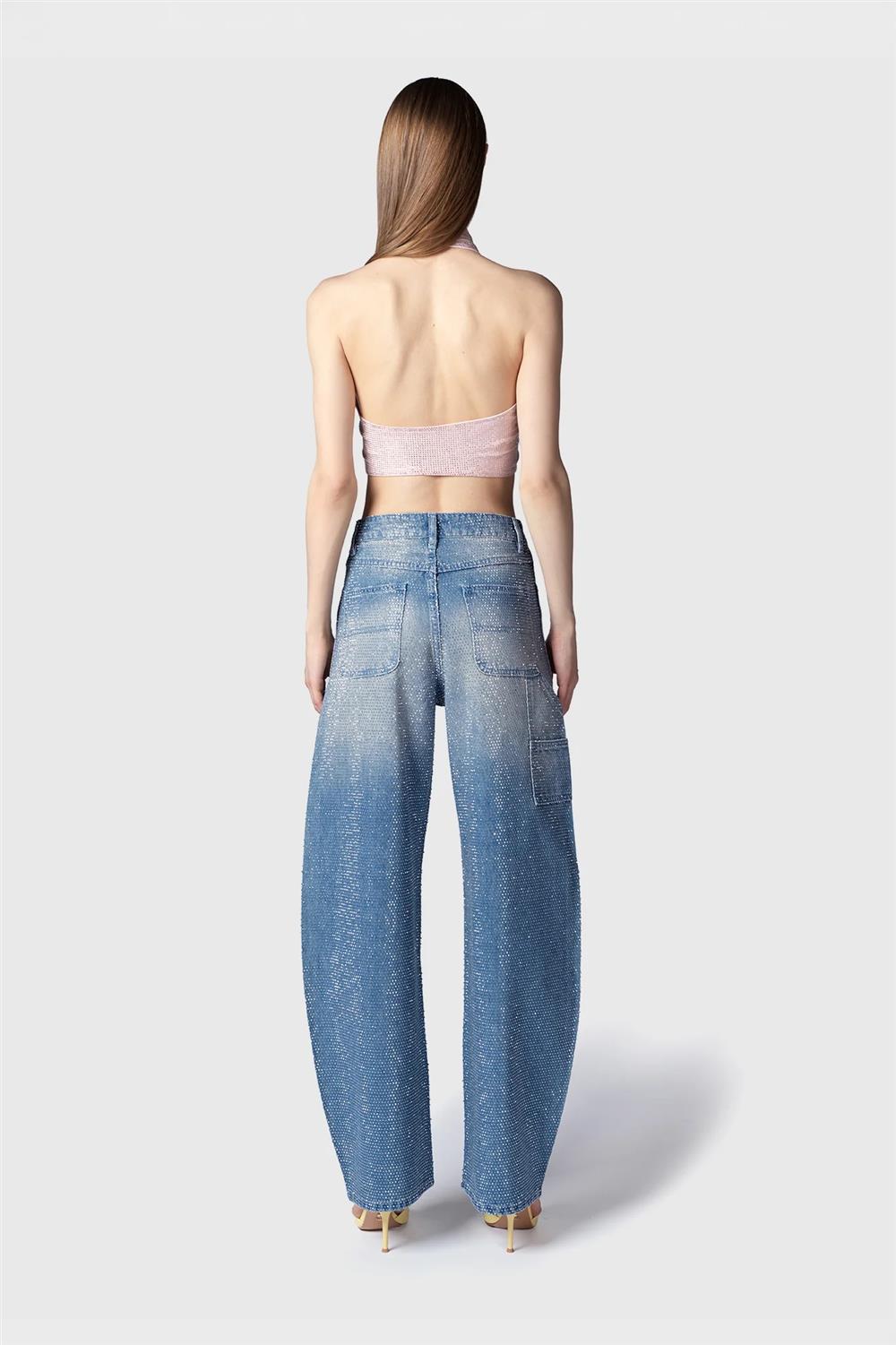 Denim baggy realizzato in cotone a lavaggio medio, interamente ricoperto di micro strass crystal applicati su tutta la superficie per una resa luminosa uniforme. La costruzione presenta una gamba ampia nella parte centrale che si restringe progressivamente verso il fondo, definendo il volume senza compromettere l’equilibrio delle proporzioni. Il modello mantiene una vestibilità regolare, con attenzione alla struttura del denim e alla continuità delle linee.