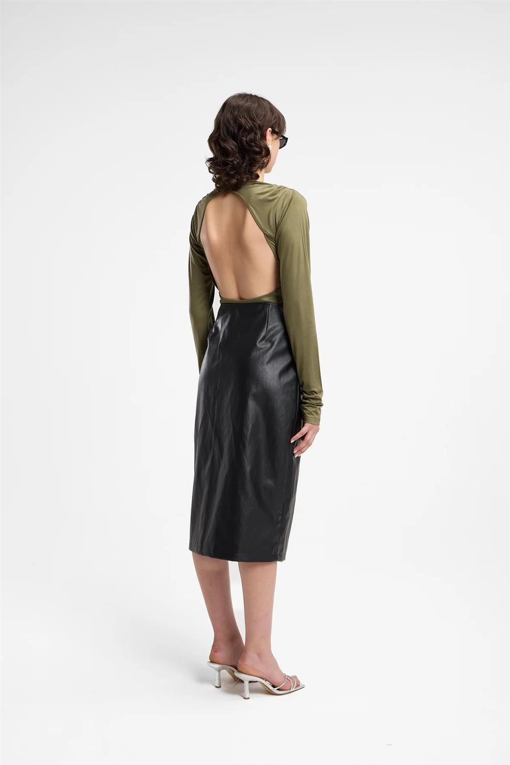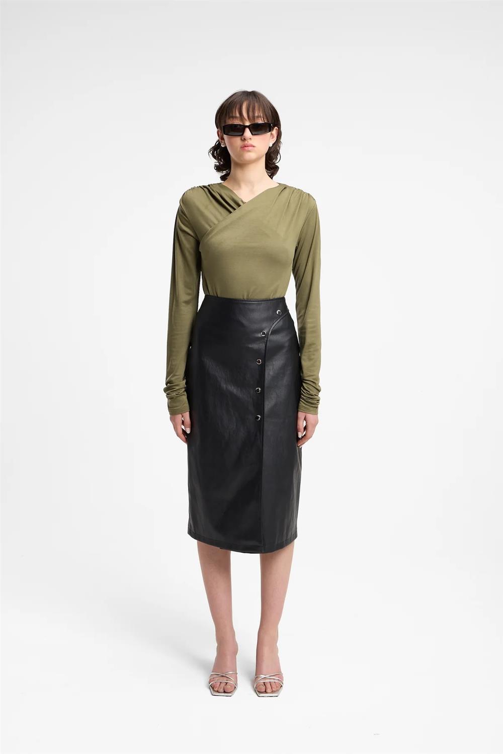 Body in viscosa stretch con incrocio arricciato sul davanti ed ampio scollo oblo’ sul retro.