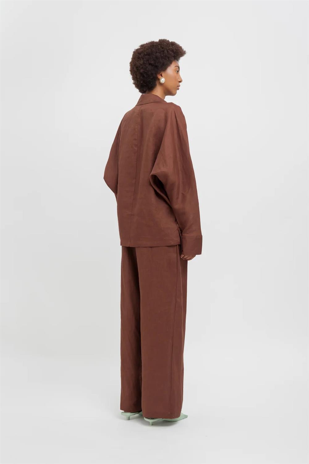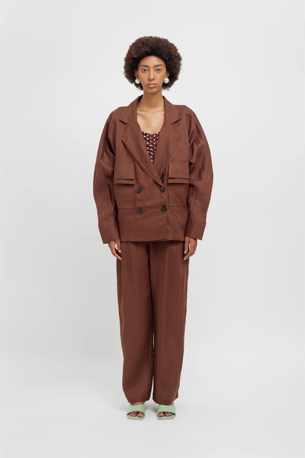 Giacca doppiopetto sfoderata in 100% lino naturale con maniche a pipistrello e fit a uovo.