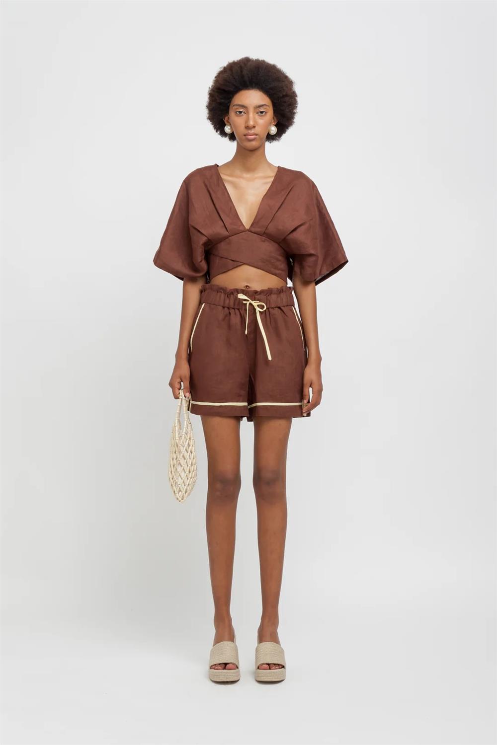 Crop top con maniche effetto petalo in 100% lino naturale.